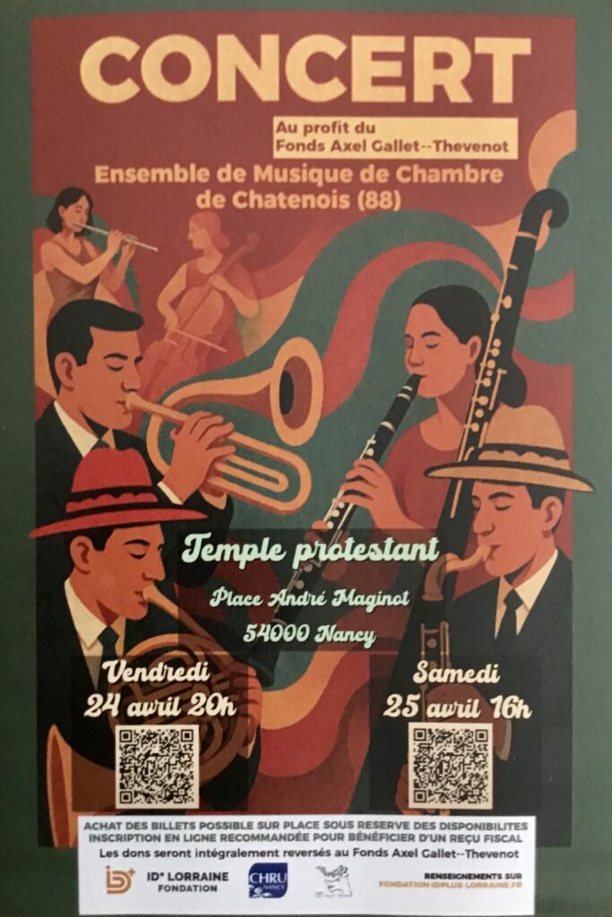 Un concert de l’Ensemble de Musique de CHATENOIS au profit du Fonds Axel Fonds Axel Gallet-Thevenot, que le Club Arlequin soutient … à ne pas manquer ! Les entrées et les dons sont déductibles des impôts …